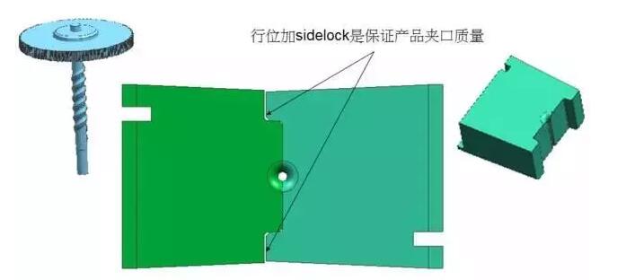 為了防止產品粘前模所以設計行位延時開模,前后模已打開一部分但是行位還沒有滑動,通過行位把產品夾住(有扣位)保證產品在后模。產品柱子大部分在行位上,所以行位要設計運水冷卻!