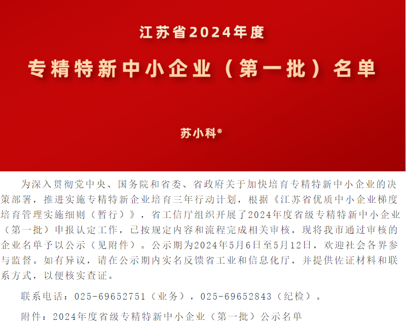 近日,省工業和信息化廳關于組織開展2024年度省級專精特新中小企業(第一批),專精特新中小企業名單進行公示。