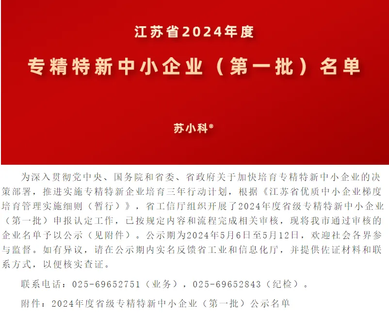 近日,省工業和信息化廳關于組織開展2024年度省級專精特新中小企業(第一批),專精特新中小企業名單進行公示。